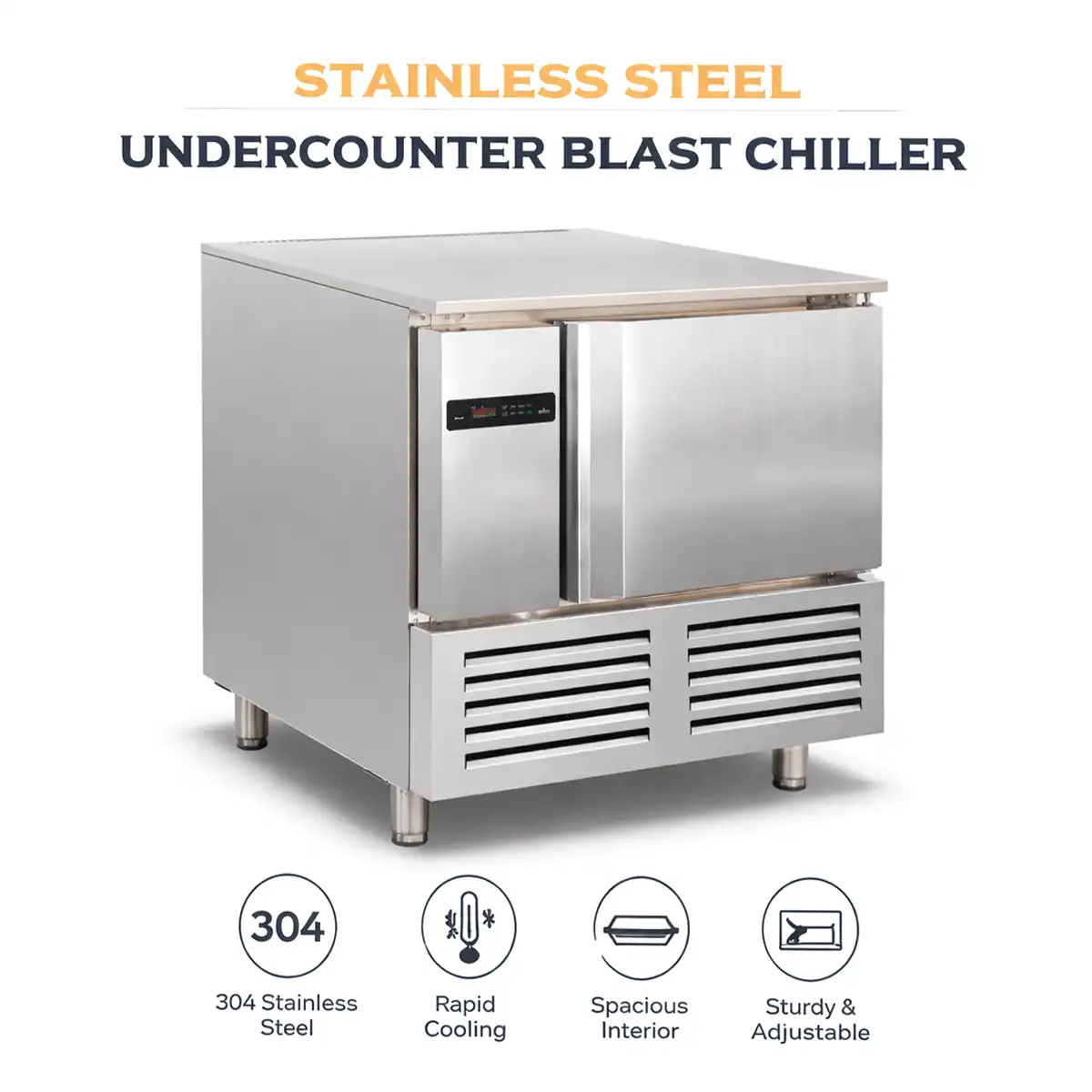 The **Blast Chiller ABT05** is not just a luxury; it’s a food safety necessity in the UAE. When hot food cools slowly in a normal fridge, it stays in the “Danger Zone” (+65°C to +10°C) for hours, allowing bacteria to multiply. This machine forces cold air at high velocity to drop the temperature to +3°C in under 90 minutes, locking in freshness, texture, and moisture.
