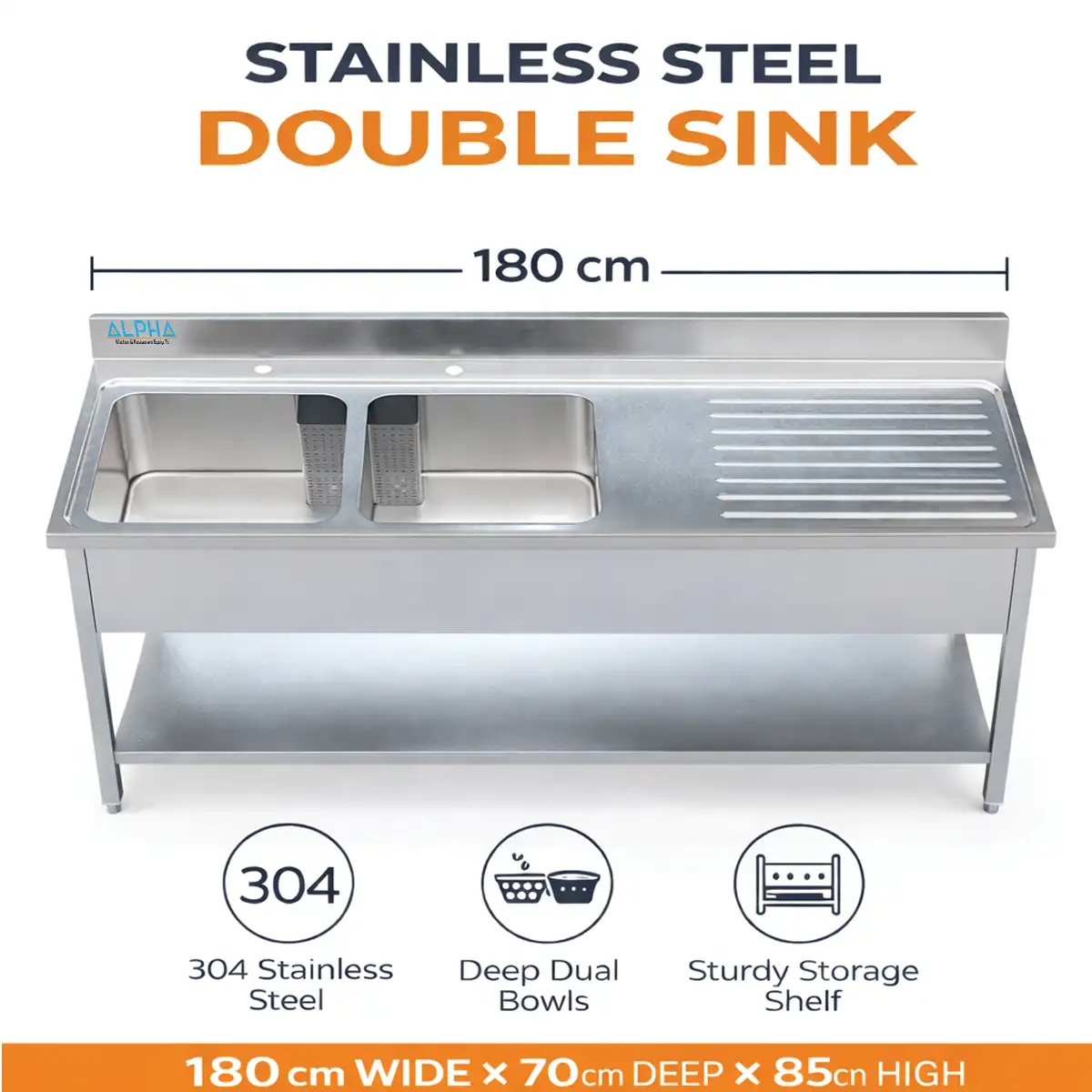 The Double Bowl Sink 180 is our largest standard washing station. With a total length of 1800mm, it provides ample room for two staff members to work side-by-side if needed. The AISI 304 Stainless Steel construction ensures that the sink remains shiny and hygienic for years, even in the humid environments of UAE commercial kitchens.