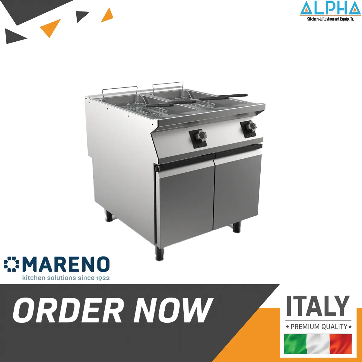 This Italian-made fryer combines reliability, performance, and efficiency. Independent tanks reduce oil waste and speed up operations. Moreover, it fits perfectly within the Mareno 900 Series modular cooking line, offering seamless design and easy integration.