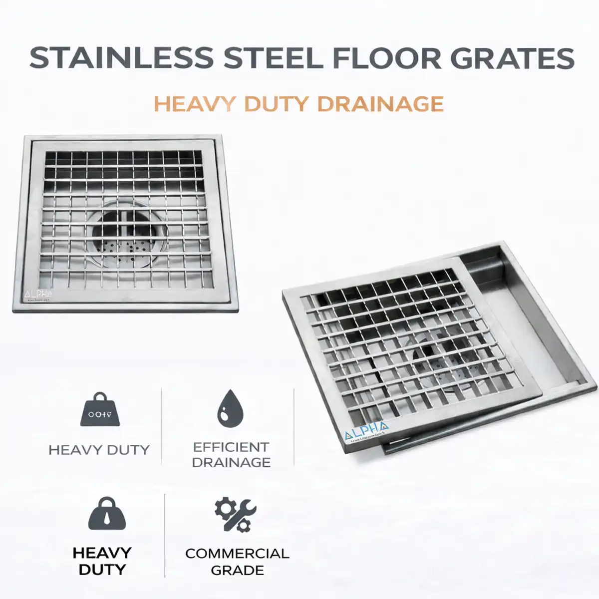 Stainless steel floor grates designed for efficient drainage, hygiene, and heavy-duty performance in commercial kitchens, food factories, and industrial wash areas.
