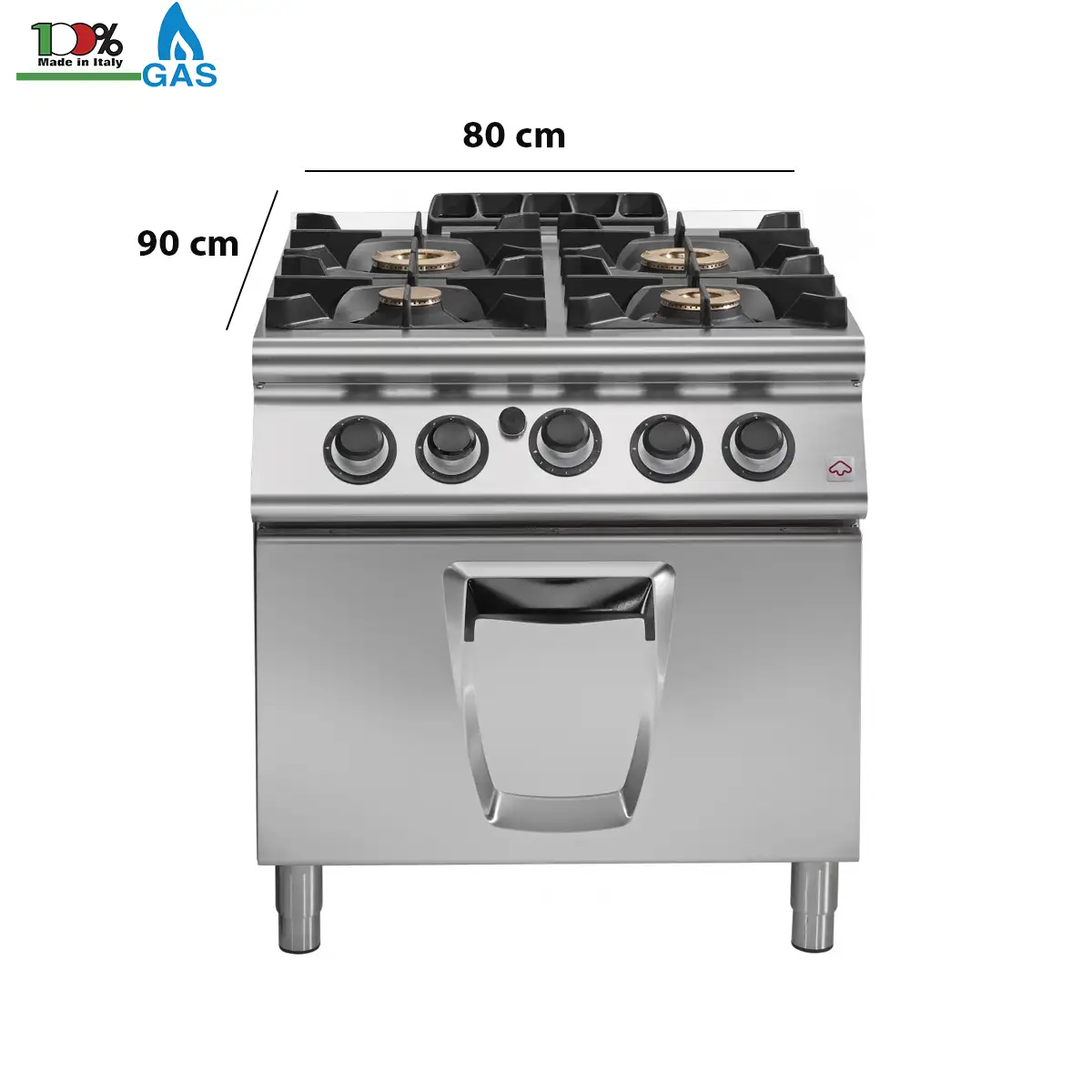 The weight of this gas cooker is 181 kg and it is made of AISI304 s/Steel, with a top thickness of 2 mm.
