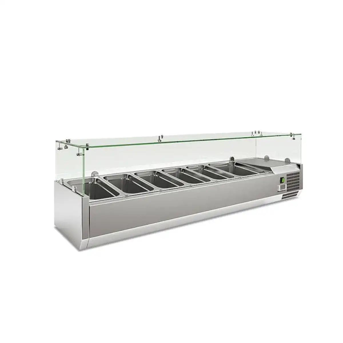 This refrigerated topping unit transforms your preparation station. First, it holds six GN 1/3 pans securely. Consequently, your chefs access fresh ingredients instantly. Furthermore, the manufacturer constructs the body from AISI 304 stainless steel. As a result, it resists corrosion perfectly. Finally, the protective glass sneeze guard keeps your food completely safe from contamination.