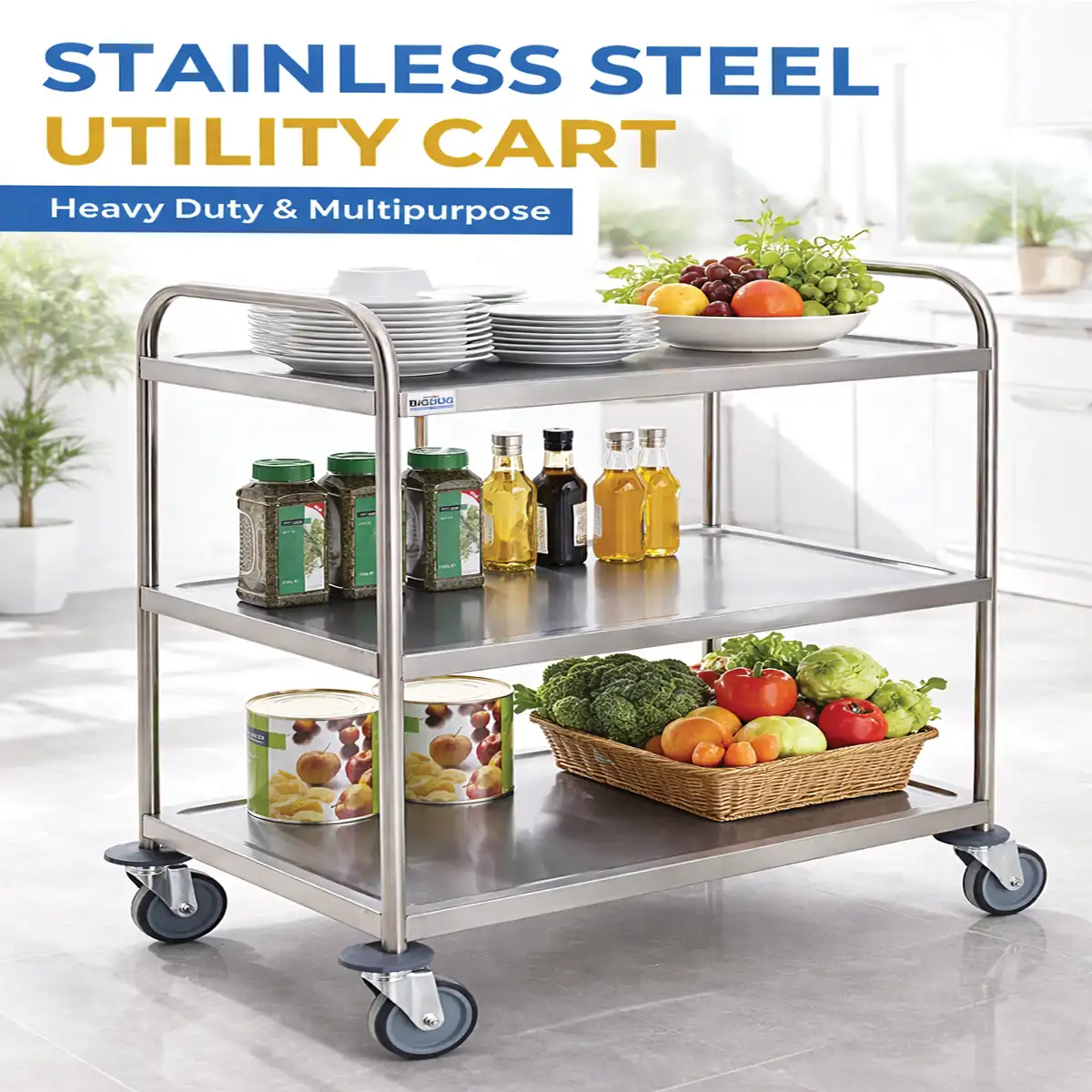 Unlike cheap plastic carts that crack or rust-prone chrome trolleys, our unit uses **premium stainless steel**. This makes it resistant to corrosion from humidity, cleaning chemicals, and food spills—perfect for the demanding environments of commercial kitchens in the UAE.